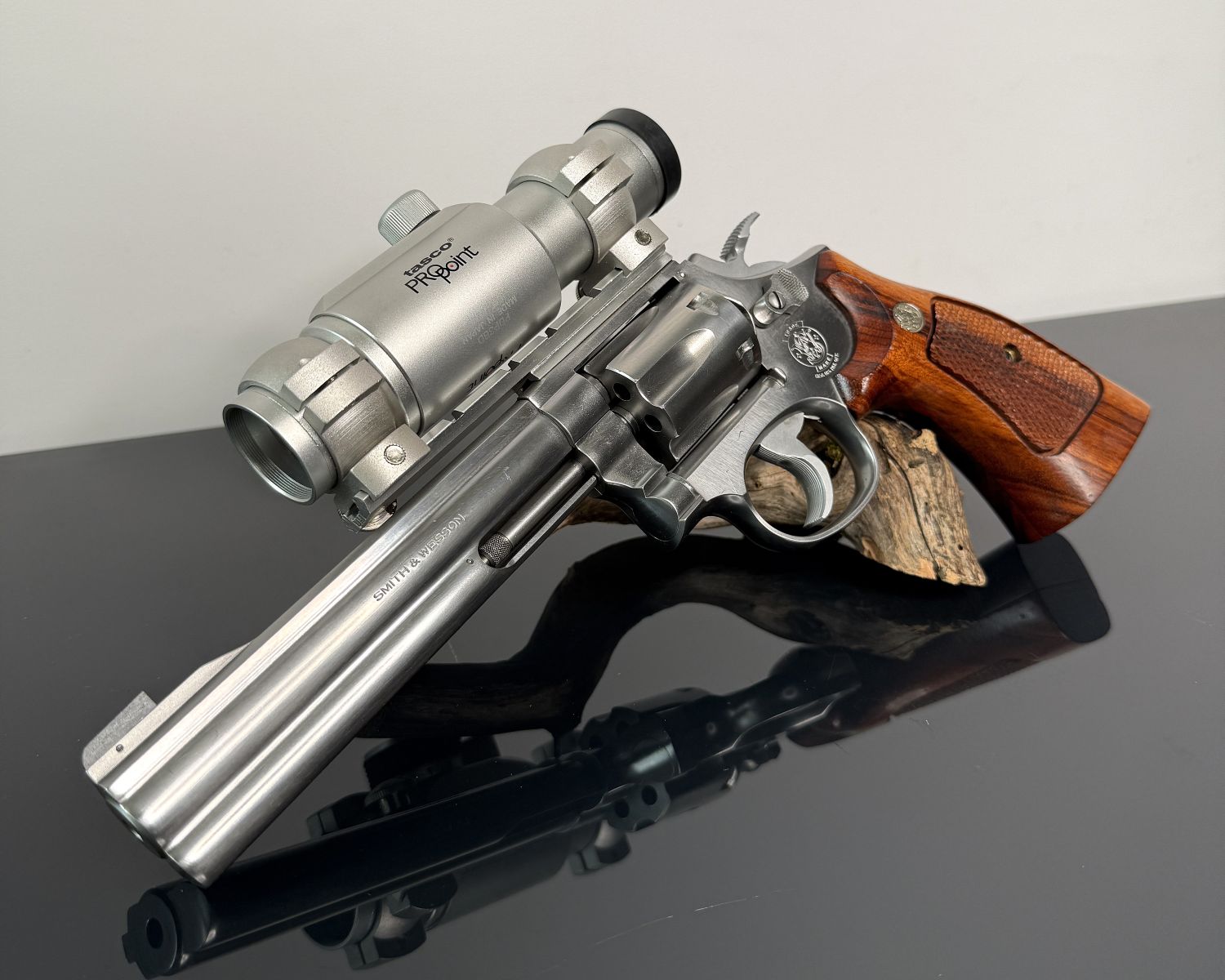 Der Revolver befindet sich in sehr gutem Erhaltungszustand. Edelstahloberflächen, Mechanik und Ausstattung präsentieren sich gepflegt. Die originale S&W Holzgriffschalen sowie das Tasco Pro Point Visier runden das hochwertige Gesamtbild ab.