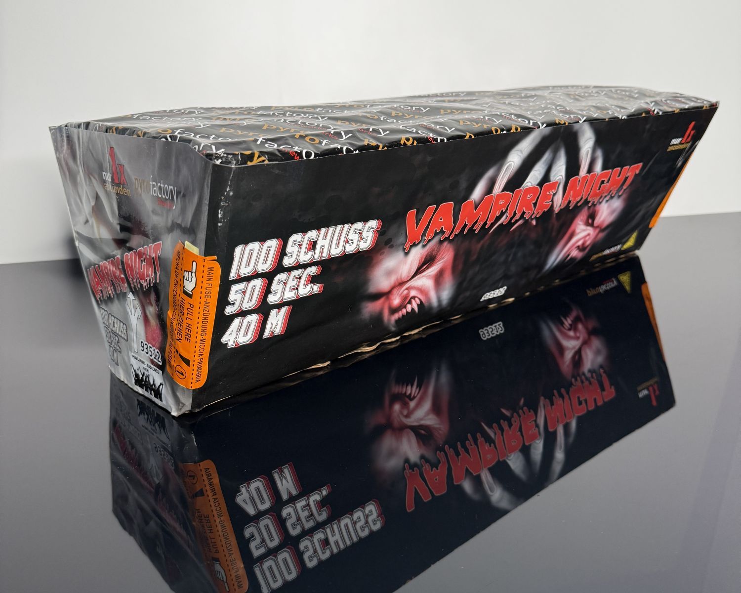 Die Vampire Night begeistert als hochwertige, gefächerte 100-Schuss Feuerwerksbatterie, die mit kräftigen Farben, dynamischen Effekten und beeindruckenden Finalsalven überzeugt. Perfekt für Silvester, Events und alle, die ein farbenprächtiges Feuerwerkserlebnis suchen.